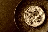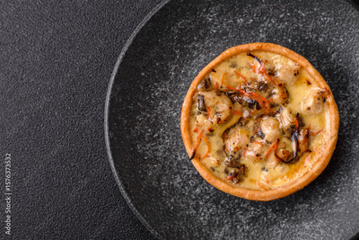 Pie or quiche, a sour tart with chicken and mushrooms, spices and herbs. Round quiche with chicken