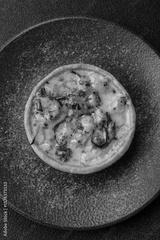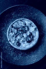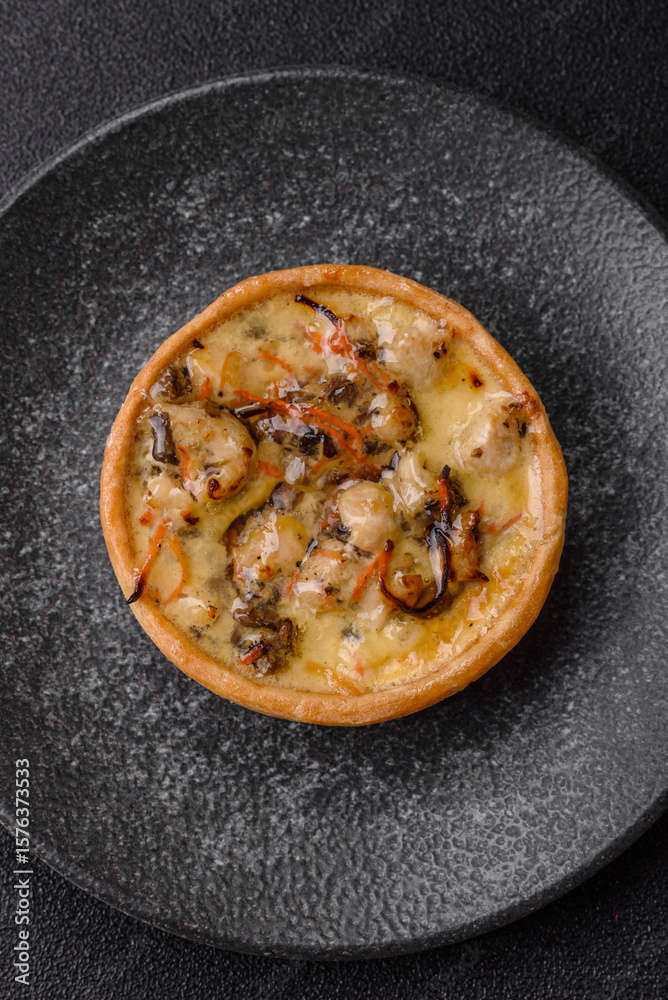 Pie or quiche, a sour tart with chicken and mushrooms, spices and herbs. Round quiche with chicken