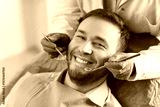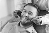 Dental health. Man sits comfortably in dentists chair, showing off white smile that exudes confidence. Dentist holds special tools in his hands for preventive and therapeutic examination of teeth.