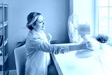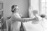 Woman enjoying freshness using electric ventilator, cooler to enjoy fresh air blowing from fan, using home appliance, equipment for cooling, improve indoor air, female uncomfortable feeling hot
