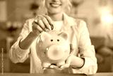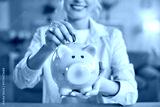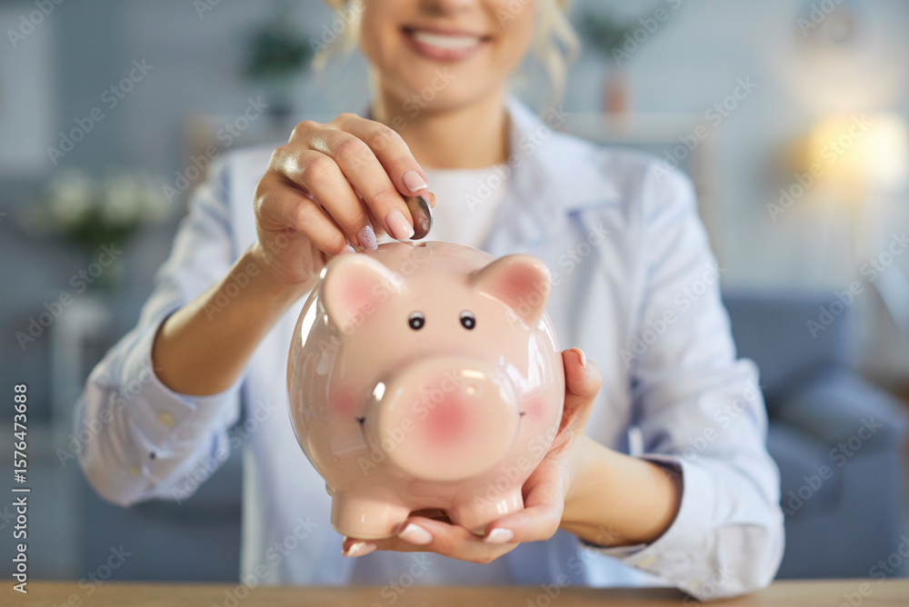Unknown woman holding biggybank, putting coins, saving money for purchasing something desirable, going to spend her savings soon, recommending finance collecting. Financial stability concept