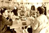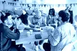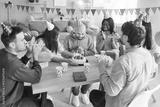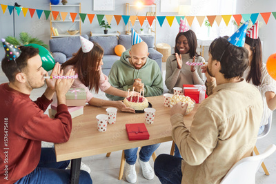 Friends happy birthday candle cake celebration at home, funny friendly group portrait applauding on party together for event, smiling people gathering making fun, enjoy time, wishing great happiness