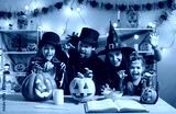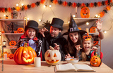 Cheerful family in Halloween costumes making scary faces behind table with glowing carved pumpkins. Happy parents and kids gesturing and grimacing while celebrating holiday in decorated room at home.