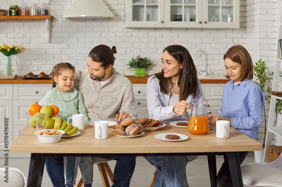 Portrait of happy family of father, mother and kids gathering in kitchen at home together having a breakfast. Young smiling parents with two little children enjoying family dinner.