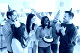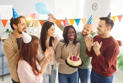 Smiling young happy african american woman holding birthday cake with candles standing at home. Friends clapping hands congratulating girl on holiday. Birthday party and celebration concept.