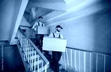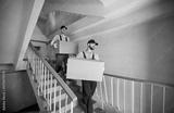 Men movers carrying big packed cardboard boxes with belongings, posing on stairs in entrance, help client move out of apartment, wearing uniform, working in removal service, being good team
