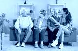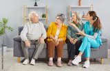 Happy nurse playing with group of a senior people in the Who I Am game at a nursing home. Fun and interactive leisure activity promoting entertainment, cognitive engagement, and social bonding.