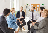 Happy business team gathers in a circle for a collaborative group meeting in the office, discussing strategies and fostering teamwork, collaboration through open communication and engagement.