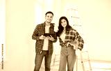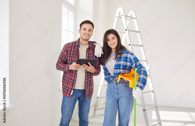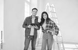 Happy couple after moving, planning future repair, using tablet in new home, young working friends having fun, energetic workers in joy, amuse doing modern living room interior, enjoy painting