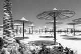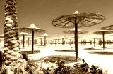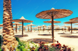 Chaise lounges and parasols on the beach against the blue sky and sea. Egypt, Hurghada