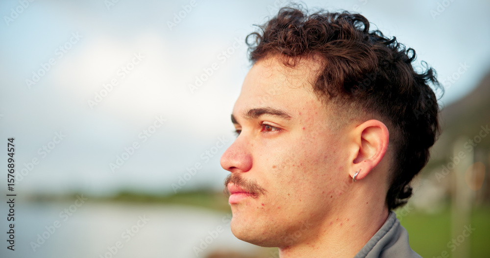 Serious, thinking and man for travel outdoor for vacation, weekend break and planning adventure. Space, male person and reflection for holiday ideas, tourist thoughts and nostalgia memory for getaway