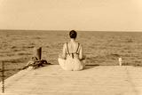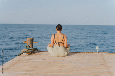 Woman meditating on a wooden pier at the sea, yoga and serenity
