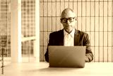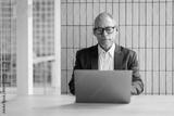 Happy latin hispanic mid aged business man working on laptop computer in company office. Smiling Indian entrepreneur manager man using pc for communication, learning at workplace. Copy space