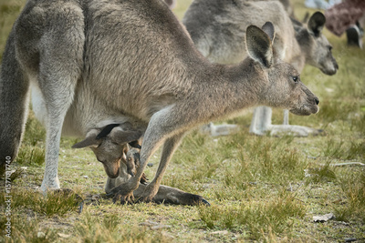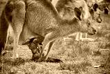 Close-up portrait of an eastern grey kangaroo in its natural forest environment in Australia. Captured in golden light, showing detail and expression.