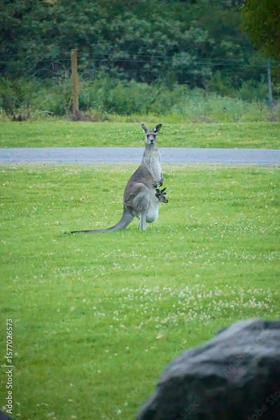 Close-up portrait of an eastern grey kangaroo standing alert in its natural forest environment in Australia. Captured in golden light, showing detail and expression.