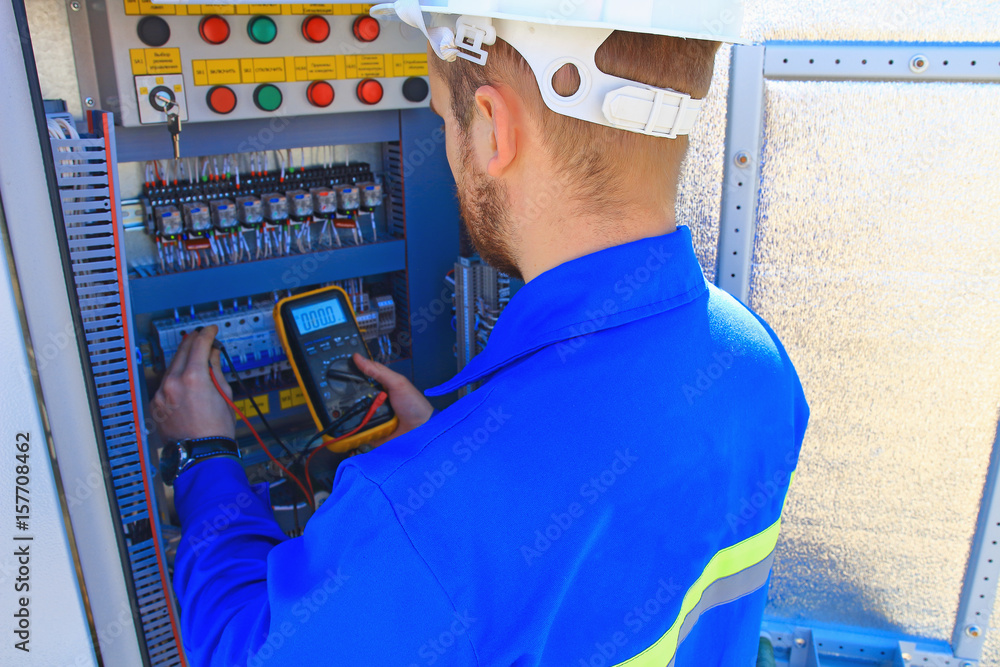 electrical engineer with a multimeter performs adjustment work in the blurred control cabinet