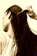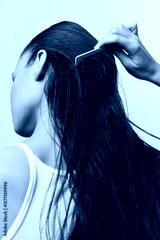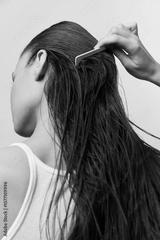 Hair care, grooming, beauty routine, woman combing wet hair, close up shot, natural hair texture, neutral background