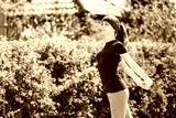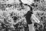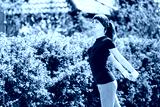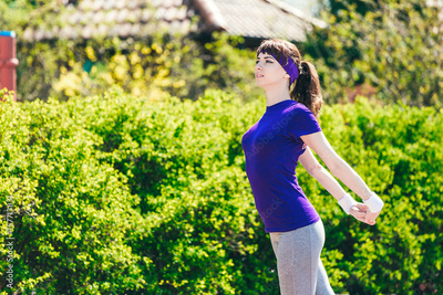 Girl in a blue T-shirt is doing sports in nature against the backdrop of bushes.young woman jogging in the park