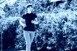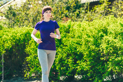 Girl in a blue T-shirt is doing sports in nature against the backdrop of bushes.young woman jogging in the park