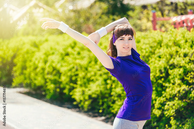 Girl in a blue T-shirt is doing sports in nature against the backdrop of bushes.young woman jogging in the park