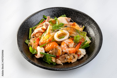 fried sukiyaki pork and seafood with vegetable and sukiyaki sauce, Thai street food