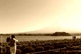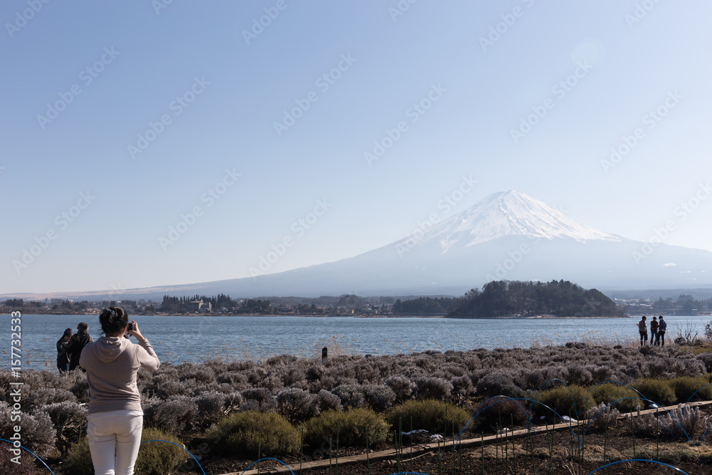 Tourists go to see and take pictures of Fuji mountain and Kawaguchiko lake