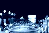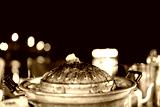 Burned frying pan. Thai grilled BBQ buffet. Pan is full of foods stains carcinogenic and cancer. Dirty Dishes concept. Selective focus.