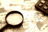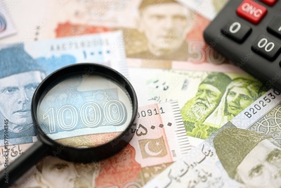 Pakistan rupees banknotes and calculator with magnifying glass. Pakistan money bills calc with loupe