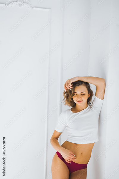 close-up portrait, studio athletic, beautiful, slim sexy young blond woman with curly hair and a sweet smile in a white top and a bikini