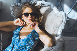 close-up portrait in studio beautiful young curly girl in sunglasses, short denim shorts and a blue blouse, girl posing for the camera and smiling