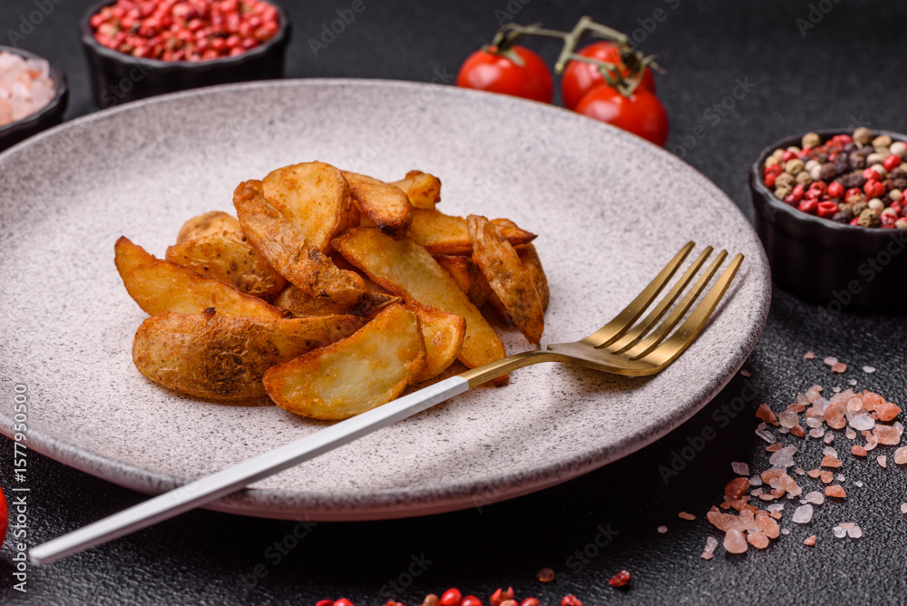 Grilled potato wedges with rosemary, cheese, salt and spices. Baked potato slices