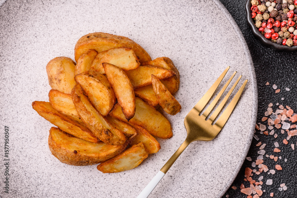 Grilled potato wedges with rosemary, cheese, salt and spices. Baked potato slices
