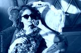 close-up portrait in studio beautiful young curly girl in sunglasses, short denim shorts and a blue blouse, girl posing for the camera and smiling