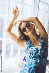 close-up portrait in studio beautiful young curly girl in sunglasses, short denim shorts and a blue blouse, girl posing for the camera and smiling