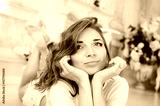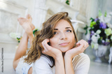 close-up portrait of a beautiful girl gentle, cute young, sexy lying on the floor, posing for the camera and smiling around flowers, white shorts and top