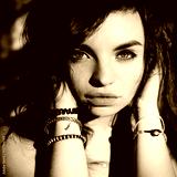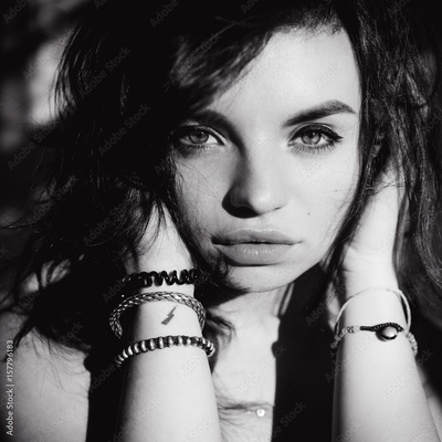 close-up portrait of a beautiful young sexy brunette girl with expressive eyes and eyes and full lips, posing for the camera
