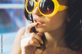 close-up portrait of a beautiful young brunette woman with full lips in yellow retro sunglasses and yellow varnish on the nails, posing and smiling for the camera