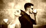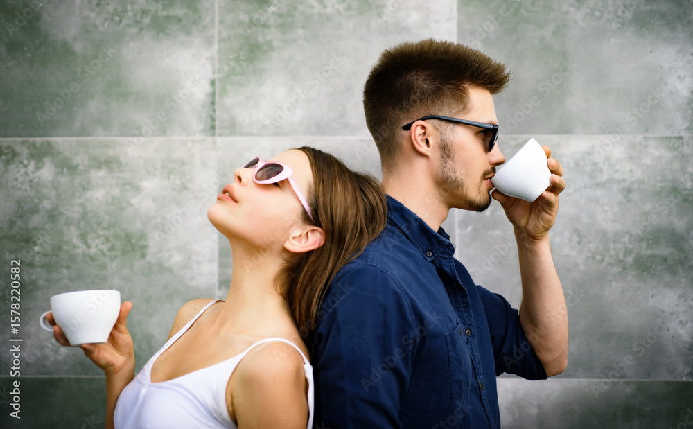 Young couple drinking coffee together. Romantic date with coffee. Man and woman with cup latte. Happy boyfriend and girlfriend with cup of coffee. Love and lifestyle. Romantic couple drinking coffee.