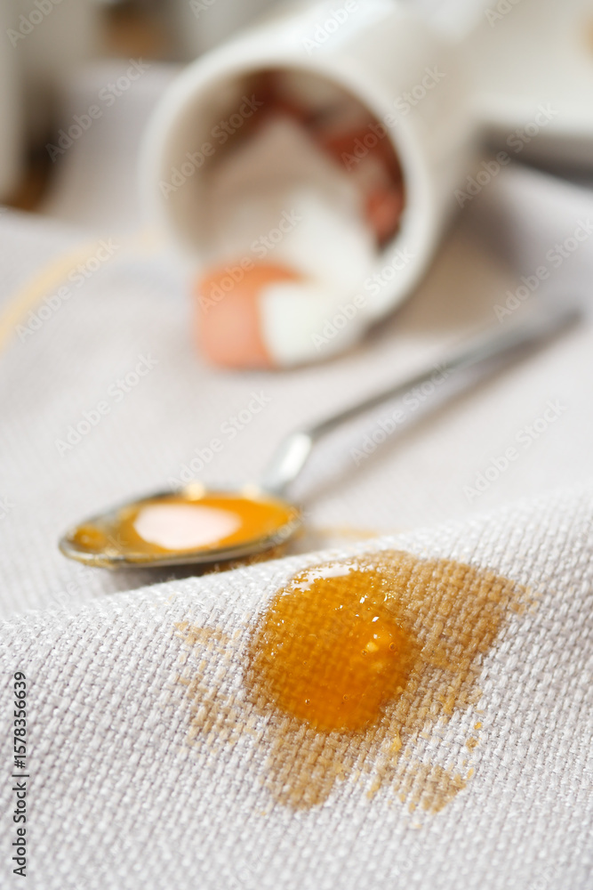 Smooth orange yolk spills from broken egg on table