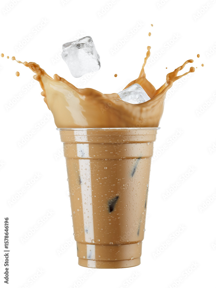 Splash iced coffee with milk and ice in disposable glass isolated on white background