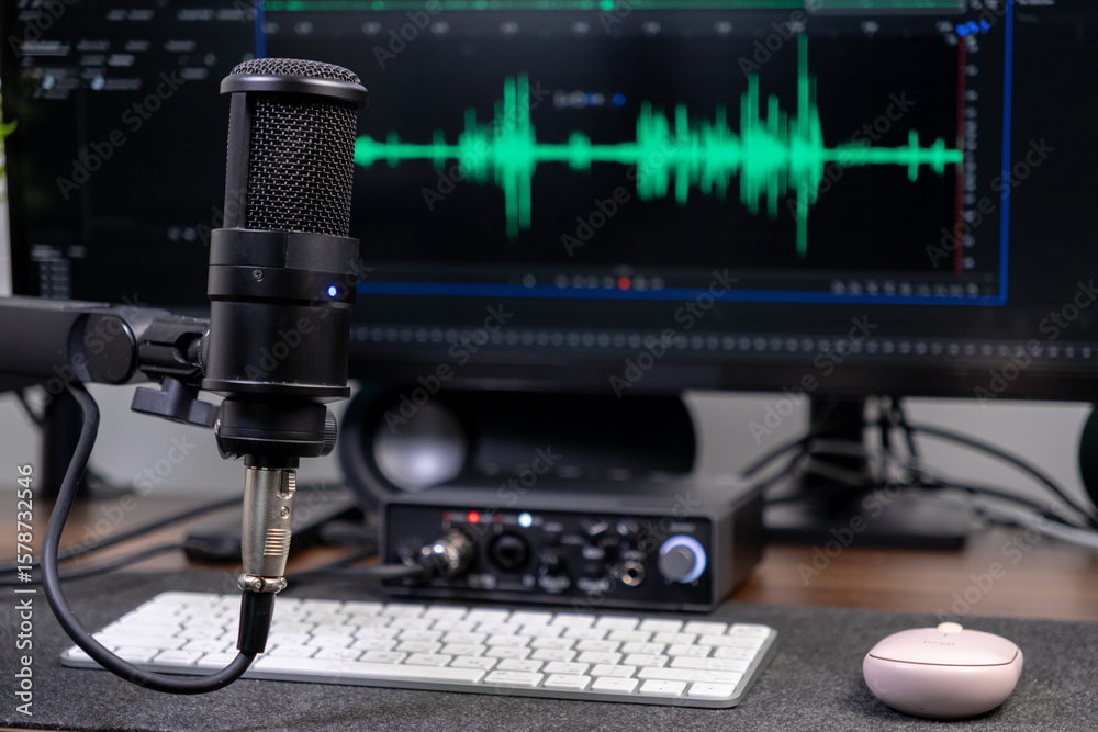 Professional black condenser microphone setup in a home audio studio, with digital sound waveforms displayed on a computer screen for podcast and music production