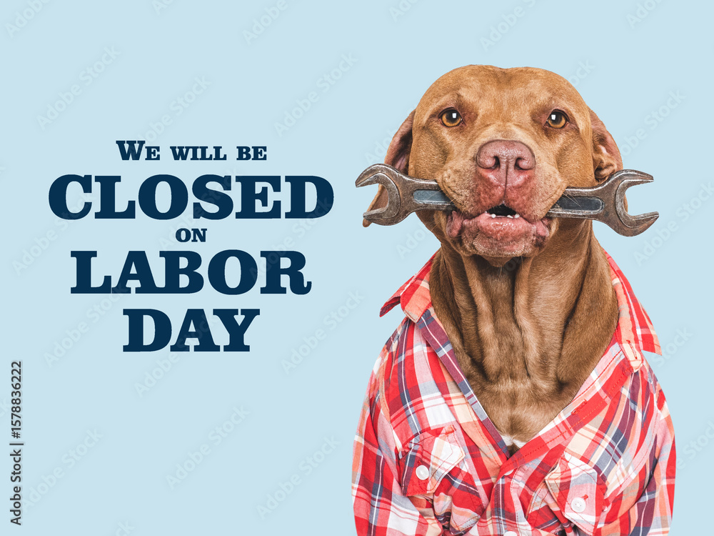Signboard with the inscription We will be closed on Labor Day. Cute dog. Closeup. Studio shot. Congratulations for family, loved ones, friends and colleagues. Pets care concept
