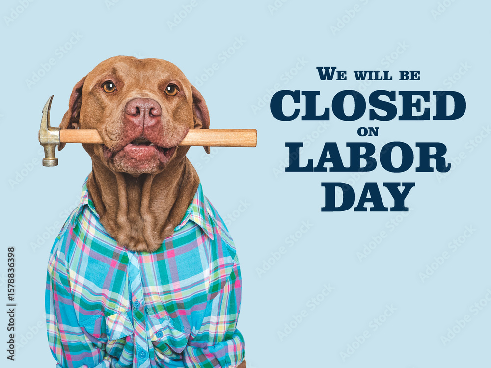 Signboard with the inscription We will be closed on Labor Day. Cute dog. Closeup. Studio shot. Congratulations for family, loved ones, friends and colleagues. Pets care concept