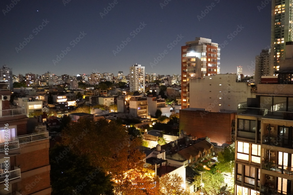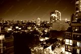 City skyline at dusk with illuminated buildings and a vibrant sunset gradient in the sky. Urban landscape featuring silhouettes of high-rise apartments and glowing city lights.