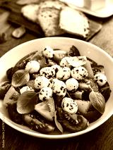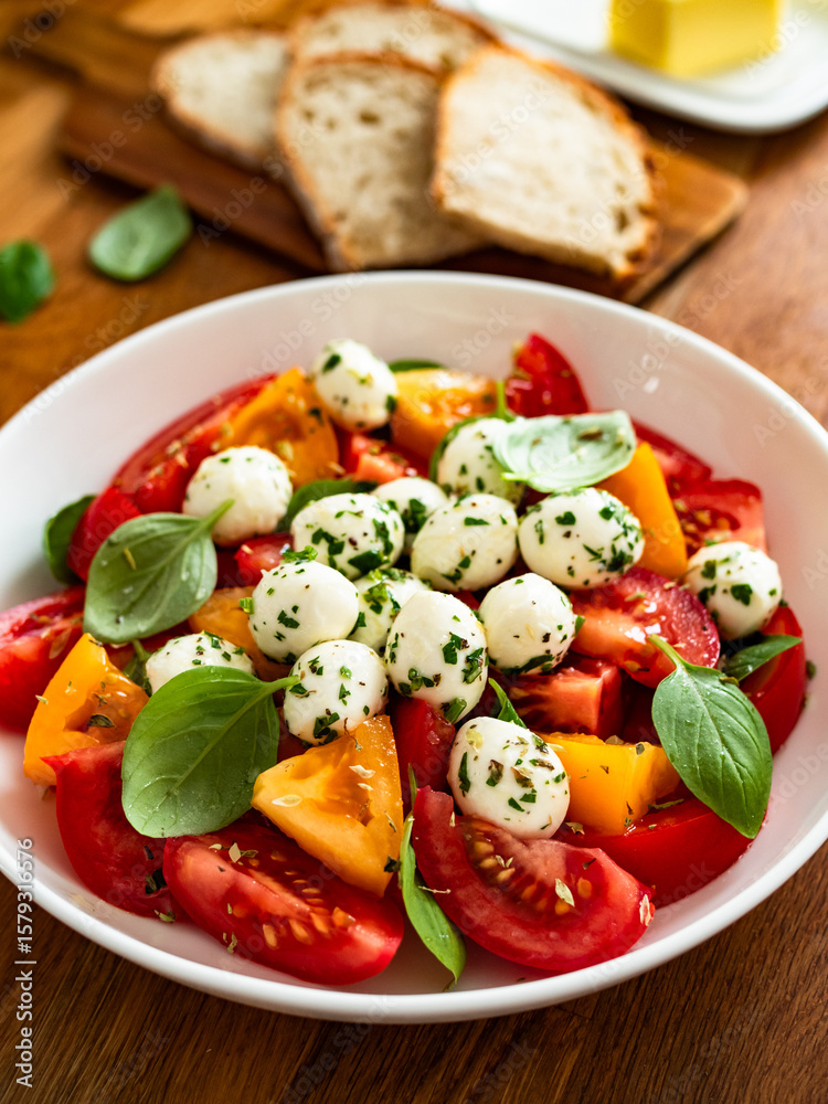 Caprese salad - tomatoes, basil leaves and mozzarella balls on wooden background