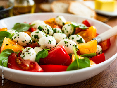 Caprese salad - tomatoes, basil leaves and mozzarella balls on wooden background
