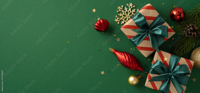 Christmas presents and decorations arranged elegantly on a green background, evoking holiday spirit