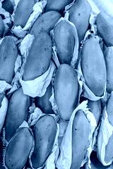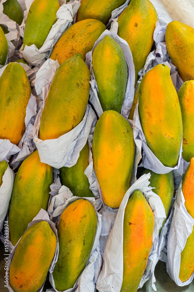 Close up view of several fresh ripe papaya fruits up for sale in the market in India.
