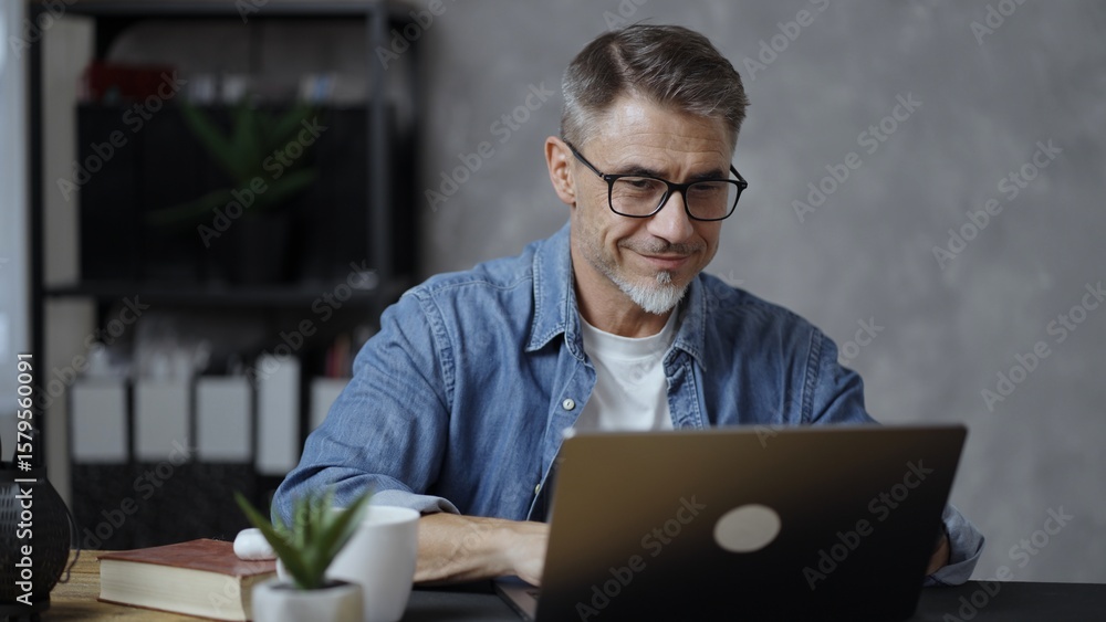 Mature entrepreneur with glasses concentrating on work, typing on laptop in office. Busy professional man, business owner. Middle aged businessman managing startup company, making financial decision.