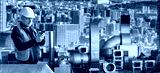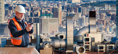 Man on roof with ventilation pipes. Worker servicing vents equipment. Man engineer with phone in front ventilation shaft pumps. Ventilation repair specialist in orange vest. Split, air conditioning